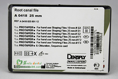 The product line: "ProTaper for Hand Use" features exactly the same instruments and clinical sequence as the rotary version. It is dedicated to all hand file users wishing to benefit from NiTi and crown-down technique. It also makes an ideal choice for the rotary file users in the treatment of difficult canal situations like, for example, apical hooks. SHAPING FILE 1 (S1) Ref: A0416-1 Lengths: 21, 25, 31 mm SHAPING FILE 2 (S2) Ref: A0416-2 Lengths: 21, 25, 31 mm FINISHING FILE 1 (F1) Ref: A0417-1 Lengths: 21, 25, 31 mm FINISHING FILE 2 (F2) Ref: A0417-2 Lengths: 21, 25, 31 mm FINISHING FILE 3 (F3) Ref: A0417-3 Lengths: 21, 25, 31 mm SHAPING FILE X SX Ref: A0416-X Lengths: 21, 25, 31 mm ASSORTMENT (SX, S1, S2, F1, F2, F3) Ref: A0418 Lengths: 21, 25, 31 mm