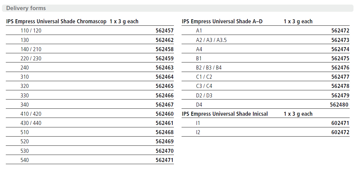 IPS Empress® Universal Shades The IPS Empress Universal Shades are available in 15 Chromascop and 9 A-D shades. They are used for the exact reproduction of the Chromascop and A-D shades. Two IPS Empress Universal Shades Incisal are available for imitating the incisal edge.